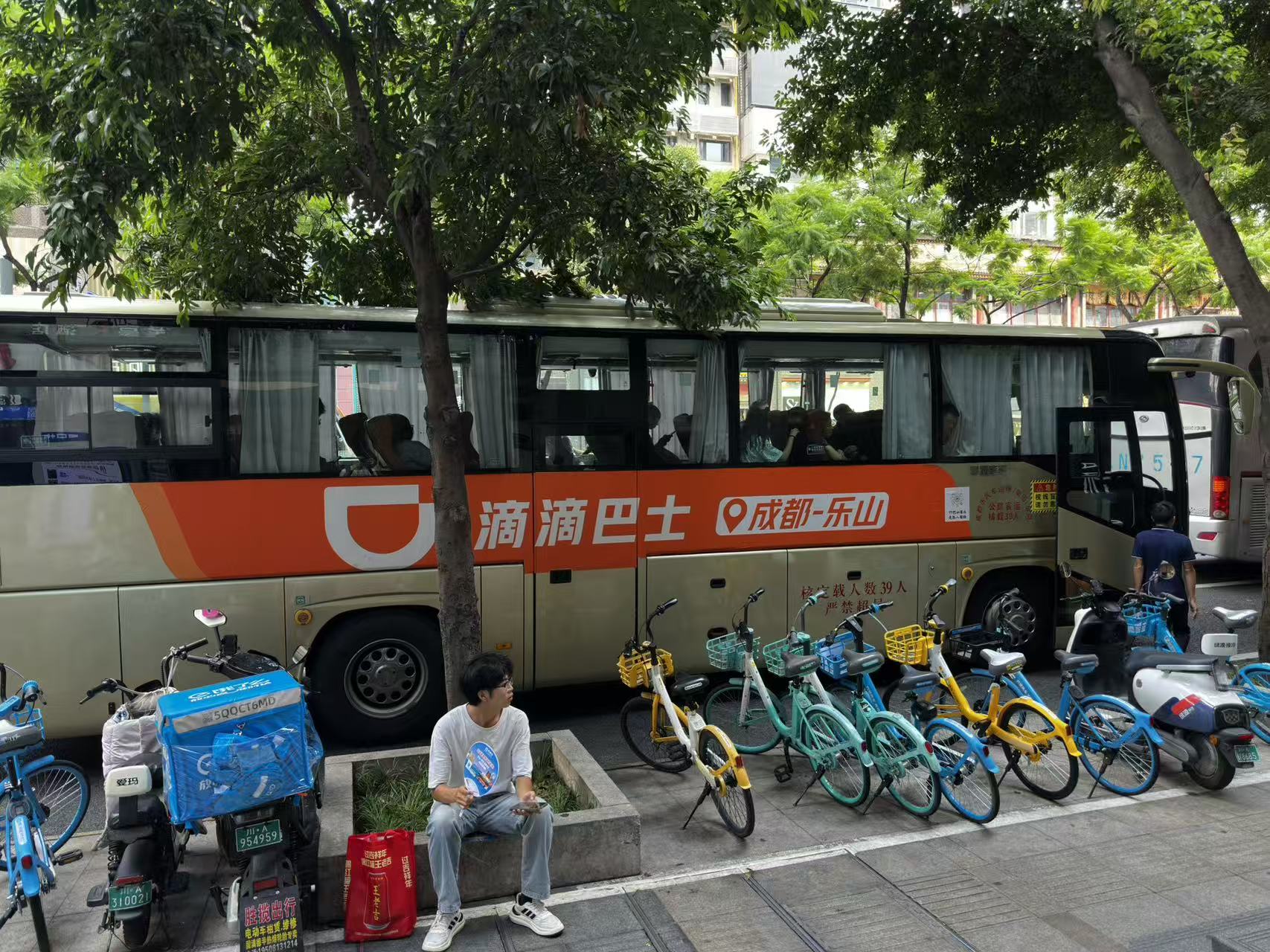 另一边,小张和三位同学也在东大街上车点等候。他们计划在暑假尾声去乐山“穷游”,通过微信公众号得知滴滴推出了成都—乐山线路站点巴士的优惠活动。虽然没抢到下午2点的班次,只能改乘3点的车,但他们仍早早来到上车点排队,希望能坐在一起。